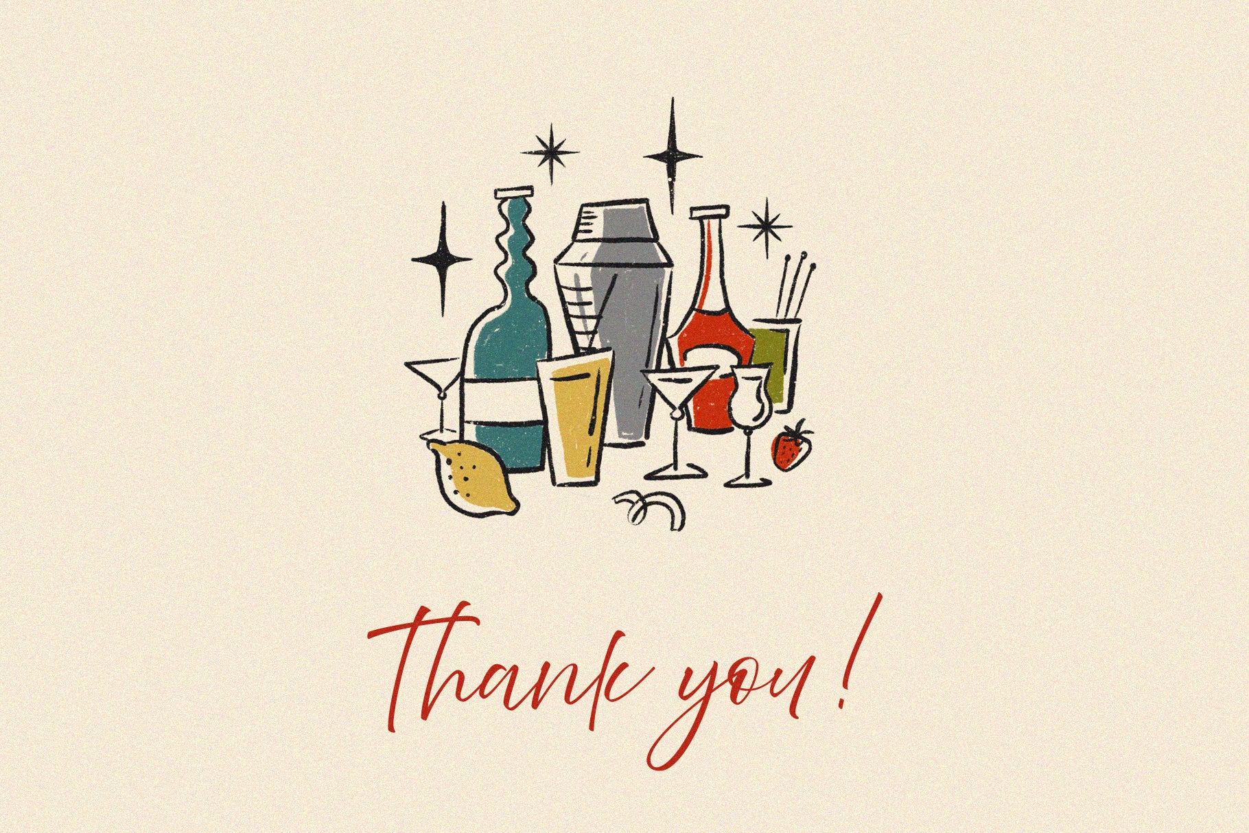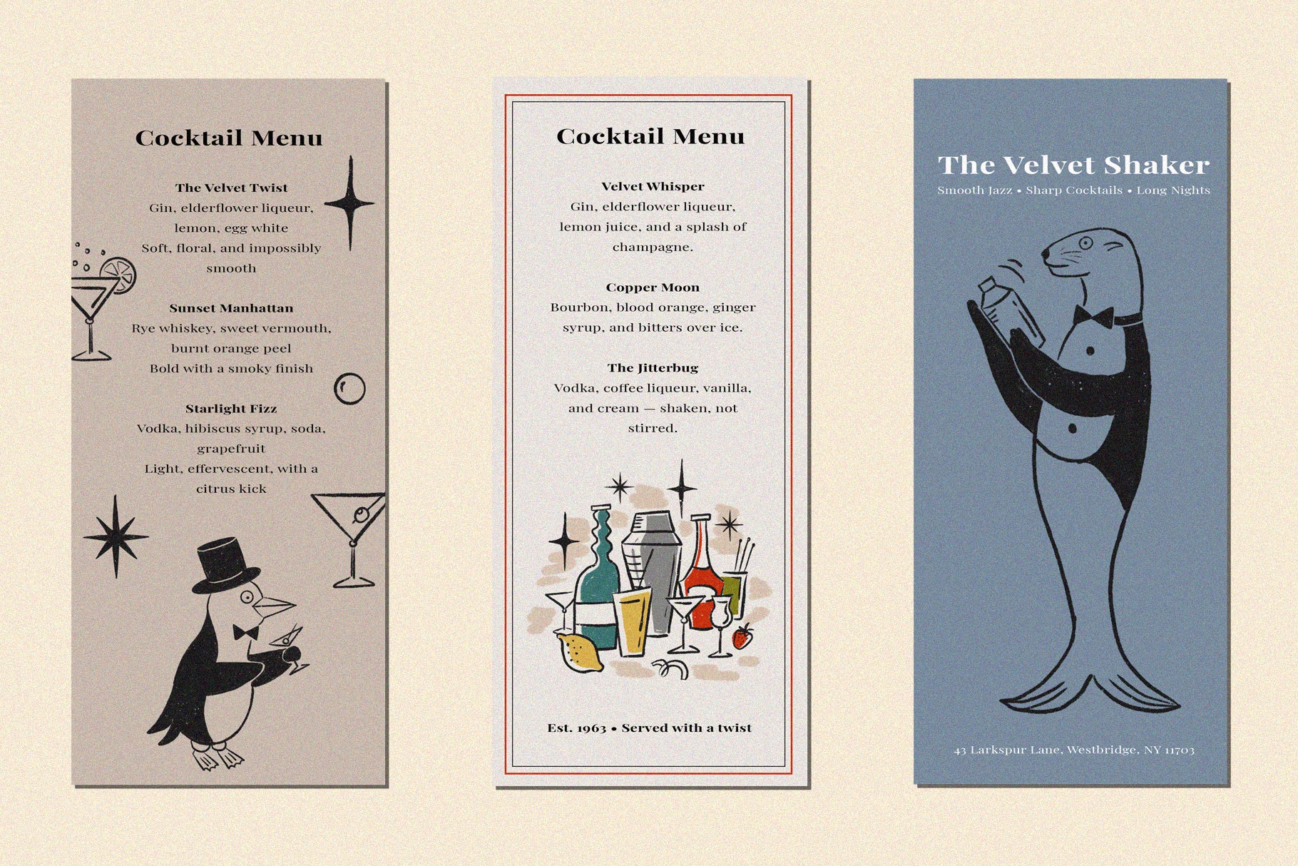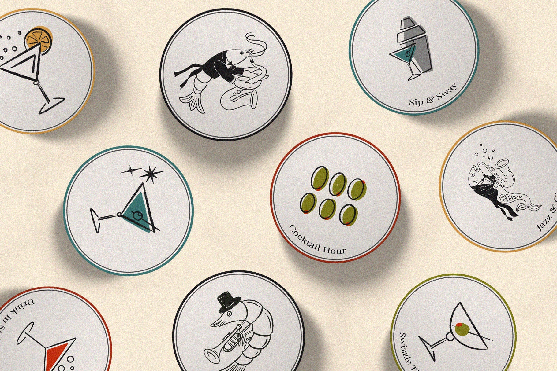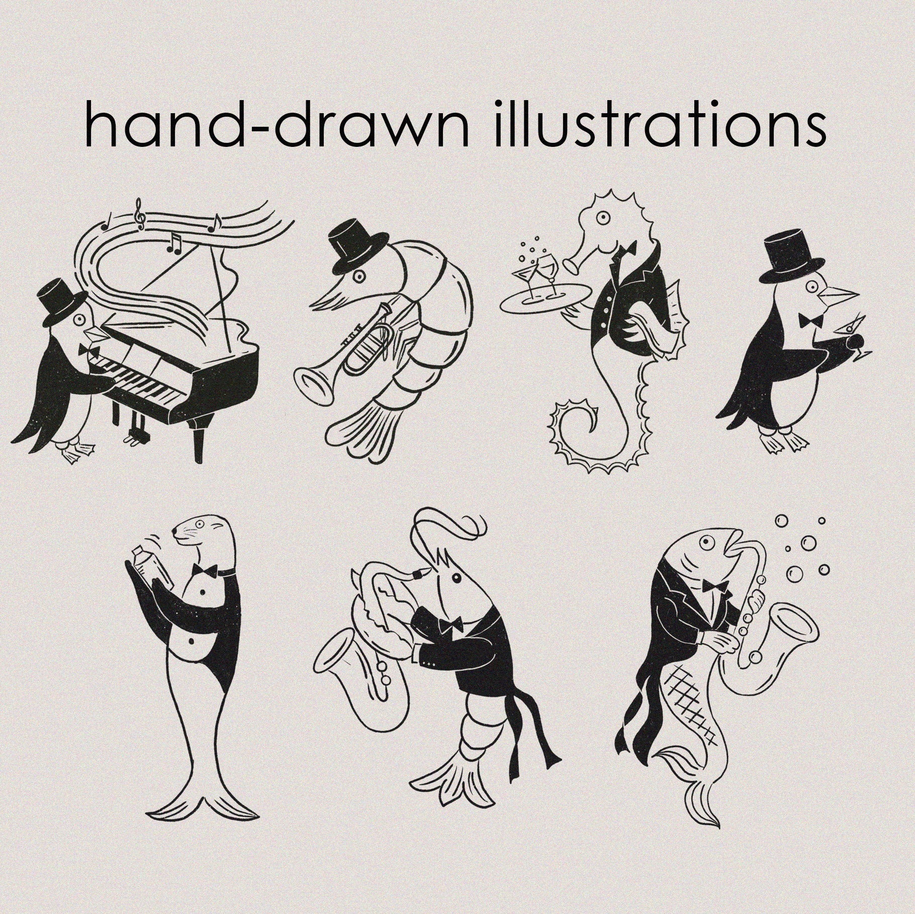 This set features a charming cast of anthropomorphic animals—penguins, shrimp, seahorses, and jazz-playing fish—all dressed to impress in tuxedos and top hats. Paired with a curated selection of cocktail glasses, shakers, garnishes, and atomic-style stars, these illustrations evoke the timeless flair of 1950s lounge culture.