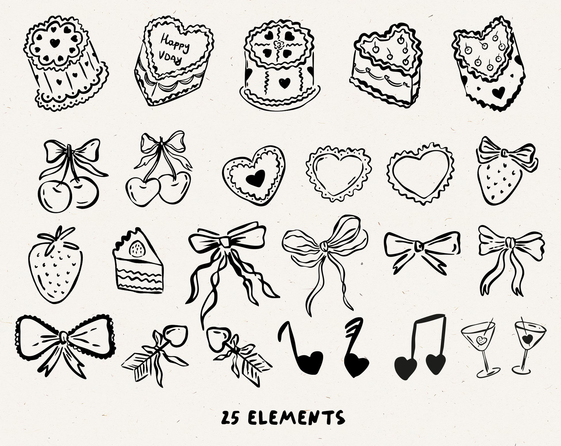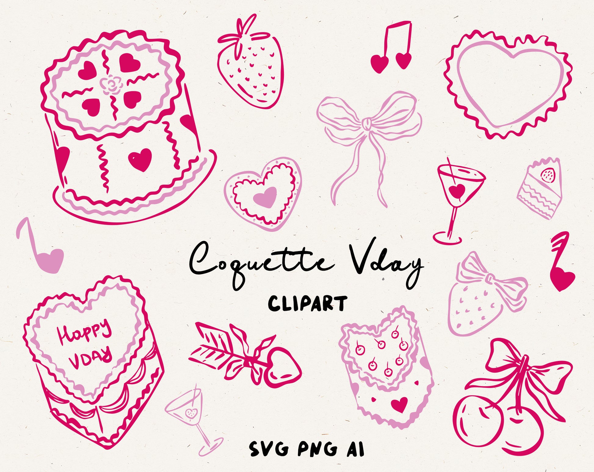 These clipart elements have a "coquette" aesthetic, featuring a Valentine's Day theme with hand-drawn, feminine, and romantic designs in pink and red tones. The set includes hearts, bows, cherries, strawberries, cakes, cocktails, musical notes, and love-themed desserts, all with a delicate, whimsical, and vintage-inspired style.