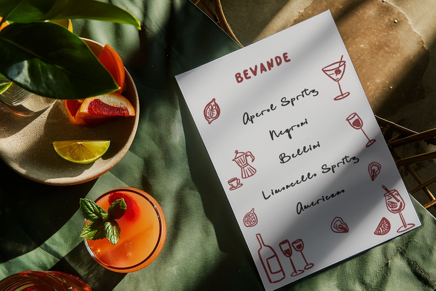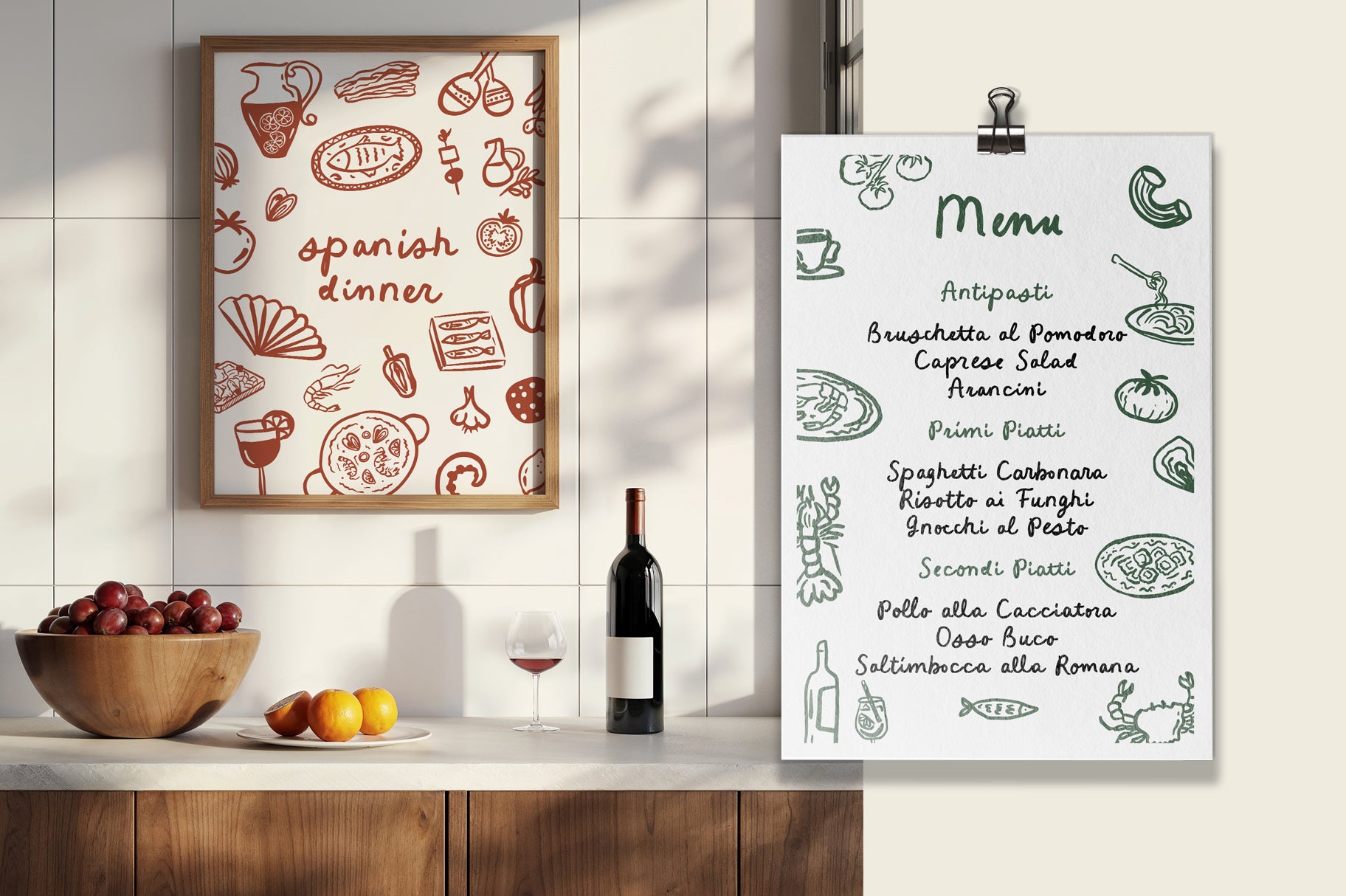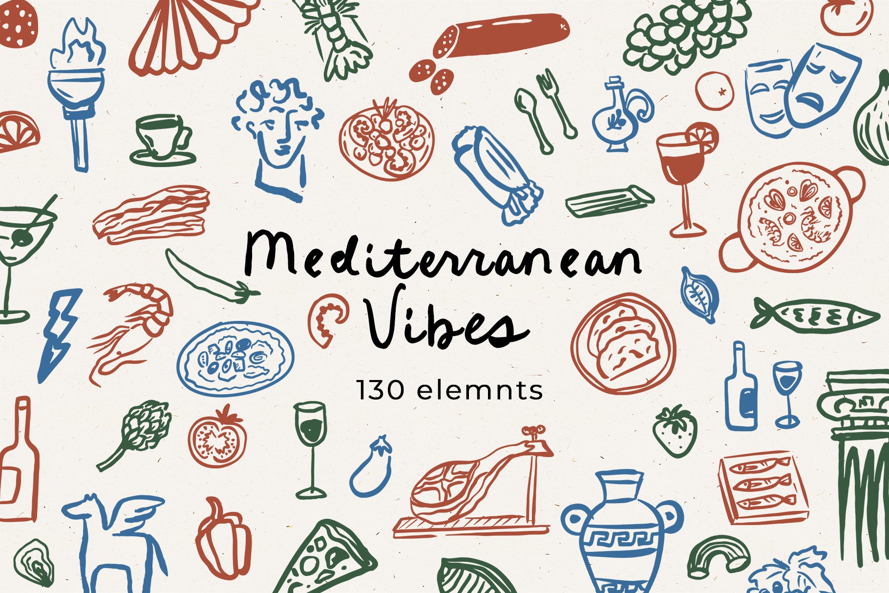 Mediterranean Vibes Clipart in a trendy Whimsical style. Fully hand-drawn Italian, Greek, and Spanish icons. This set includes more than 100 hand-drawn elements. This set is perfect for creating wedding invitations, greeting cards, wrapping paper, advertising, menus for bars and restaurants, branding, posters, printing, textiles, design, festive supplies, interior decor, and more.
